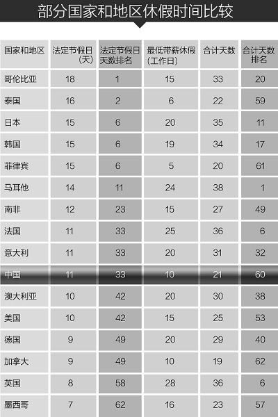 法定节假日天数排名、合计天数排名均为在62个国家和地区中的排名 制图:宋嵩 在新的放假安排中,法定节假日的总天数并没有调整,只是对原有的11天节假日做了更加均衡的安排。为何没有增加放假天数?据有关专家分析,休假水平应该与国家经济社会的发展水平相适应。休假水平是职工福利的重要组成部分,具有很强的刚性特点。我国仍然是一个发展中国家,在世界分工体系中仍然是劳动密集型产业占明显优势,劳动力成本不宜过快增加。增加法定节假日天数必然会增加企业用工成本,一定程度上削弱企业竞争力。同世界其他国家和地区相比,我国现行法定节假日天数为11天,接近世界平均水平,已经超过了美国、英国、加拿大、德国等国家。我国职工平均年法定休息日为125天(法定节假日11天,周休日104天,职工带薪年休假平均10天),已超过全年时间的1/3,与我国经济社会发展水平基本相适应。 从世界其他国家和地区的节假日安排看,每个法定节假日基本为1天;即使是圣诞节,也只有德国、法国、英国放假2天,其他国家均放假1天;国庆节(独立日)各国基本放假1天。因此,从国际通行做法看,不宜增加春节及“五一”劳动节放假天数。 据对世界62个国家和地区法定节假日和带薪年休假的有关调查比较,62个国家和地区法定节假日平均为11.7天。我国(11天)排在并列33位,属中等水平。62个国家和地区工作10年的职工带薪年休假平均为19个工作日。我国(10个工作日)排在并列59位,仅高于泰国(6个工作日)和菲律宾(5个工作日)。(如图) 通过比较可以看到,我国法定节假日天数与世界平均天数非常接近,但职工带薪年休假与世界平均天数有较大差距,导致我国职工总体休假水平明显低于世界平均水平。 自2007年国务院颁布《职工带薪年休假条例》以来,社会上越来越多的人认识到落实职工带薪年休假制度的重要性。但受文化背景和我国劳动力市场供求关系的影响,带薪休假只在部分人群中得到落实,有关调查显示,2012年不同程度地享受带薪年休假权利的职工(含未休假但依法给予工资补偿的职工)约为50%。 有关专家建议,今后要采取有效措施切实推动落实职工带薪年休假制度。各级党政机关领导应带头落实《职工带薪年休假条例》,形成示范效应。人力资源社会保障部门要把职工带薪年休假作为劳动监察的专项内容,定期进行监督检查。工会组织要采取集体协商等有效措施维护职工的合法休假权益。教育部门要督促各地在确保学习时间总量不变的情况下安排中小学放春假,为职工利用带薪年休假安排家庭旅游创造条件。 对我国法定节假日制度今后的发展方向,有关方面负责人介绍,法定节假日安排应体现以下考虑:一是立足国情,逐步完善;二是传承文化,以人为本;三是分布均衡,运行平稳。
