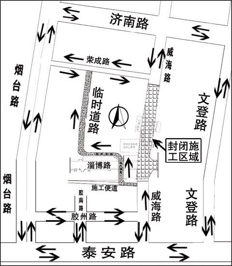 一、为方便群众出行,按照市政府安排,建设单位在封闭区域西侧修建临时道路。因临时道路较窄,为确保交通安全、畅通,社会车辆实行单向通行。威海路与淄博路路口以南自南向北行驶的社会车辆,可经临时道路--荣成路驶出。威海路与淄博路路口以北由北向南行驶的社会车辆,需绕行烟台路和文登路。