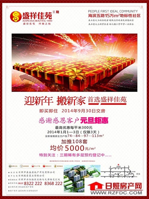 盛祥佳苑感恩客户元旦钜惠,每平米最高优惠300元,2014年1月1日-3日(仅限3天),全新主力户型74-84-97-113㎡,加推108套,均价5000元/㎡,2014年9月30日交房,即买即住!