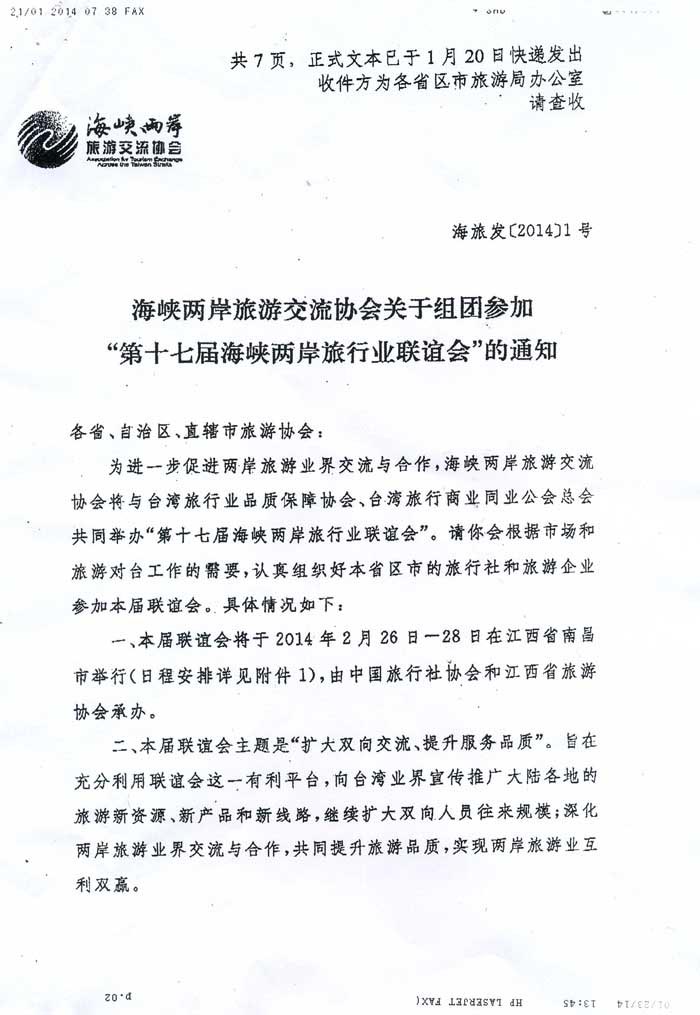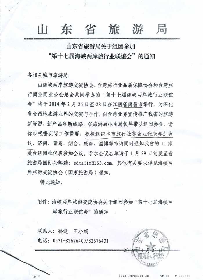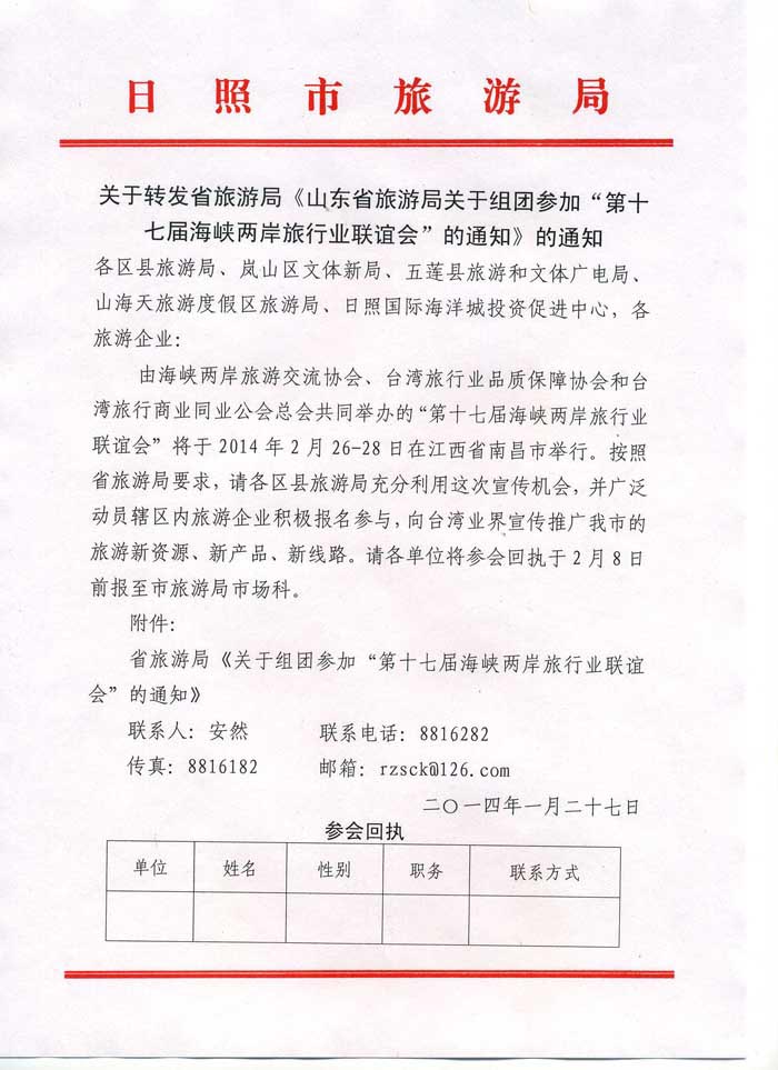 关于转发省旅游局《山东省旅游局关于组团参加“第十七届海峡两岸旅行业联谊会”的通知》的通知(2014年01月27日)