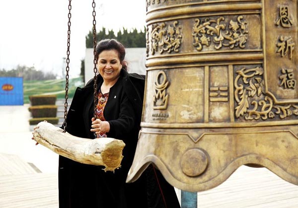 3月4日,土库曼斯坦驻华大使鲁斯捷莫娃女士一行两人来我市访问。访问将致力于推动我市与土库曼纳巴特市建立友好城市关系,推动日照港与土库曼巴希港建立友好港口,加强我市与土库曼斯坦之间经贸文化交流合作。图为鲁斯捷莫娃在万平口广场饶有兴趣地敲起钟。