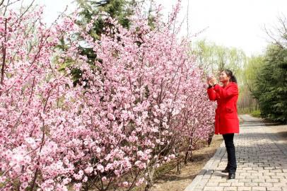 3月30日上午,在新市区一公园内,一位市民正流连于绿树红花间,并用手机拍下眼前的美景。连日来,日照市百花绽放,春色盎然,处处可见醉人的春色。