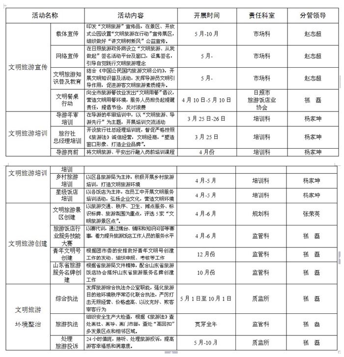日旅[2014]13号 为进一步弘扬社会新风尚,在旅游行业深入开展“擦亮城市窗口 树立文明形象”集中整治活动(日文明委[2014]5号),全面提升日照旅游行业文明服务水平,为日照旅游业又好又快发展提供精神力量和道德支撑,根据中央、省、市文明委的部署,决定在日照全市旅游行业全面开展“文明旅游在行动”活动,积极引导旅游从业人员、广大市民游客自觉革除不文明行为,遵守社会公德、维护旅游市场秩序,努力在日照形成旅游出行和谐有序的市场环境。现制定工作方案如下: 一、工作目标 至今年年底,“文明旅游在行动”将结合旅游行业实际,坚持以“政府引领、企业参与、典型示范、社会监督”的总体思路,把旅游行业开展“文明旅游在行动”与开展群众性精神文明创建活动紧密结合起来,大力加强企业精神、文明建设,发挥文化陶冶、熏陶、教化的重要作用,潜移默化地提高旅游行业从业者的道德水准、诚信守法意识和文明素质,凝聚全行业从业人员的力量,积极倡导绿色出游、明白消费,开展“文明旅游在行动”,形成和谐有序的旅游秩序,为建设国际滨海名城创造良好的软环境。 二、工作措施 (一)开展文明旅游宣传 活动期间,将组织旅行社、旅游饭店、旅游景区(点)等涉旅行业在其营业场所醒目位置张贴“文明旅游在行动”、“讲文明树新风”宣传标语、宣传画,悬挂宣传条幅,印制文明旅游宣传品并免费发放,在景区、开放式公园等地设置“文明旅游在行动”宣传展区,发放文明旅游宣传资料,开展旅游咨询和品质旅游产品线路推介等活动。 同时,在日照市旅游政务网上设立“文明旅游、从我做起”签名活动平台及窗口,征集旅游企业负责人、导游员、旅游车司机、广大游客等网友签名,邀请广大网友共同作出承诺,自觉践行文明旅游理念。 根据《中国公民国内旅游文明公约》、《中国公民出境旅游文明行为指南》要求,结合日照旅游行业特点和管理职能,开展公民旅游文明素质主题教育活动,普及文明旅游知识,促进游客旅游素质显著提升,自觉维护旅游秩序,无吵架斗殴、损坏公物、乱丢废弃物现象。发挥导游员和领队第一宣传责任、第一监督员责任、第一反馈员责任的文明旅游引导责任制,不断提升管理服务水平,优化旅游大环境。 日照市旅游饭店协会发动宾馆饭店和社会餐馆积极参与“文明餐桌大行动”,向全市餐饮业发出“文明用餐”倡议。宾馆饭店要营造文明用餐环境,引导顾客自觉文明就餐,赋予服务人员在文明用餐中担负起监督提醒责任,提倡节俭、反对浪费,养成良好文明就餐习惯。 (二)开展文明旅游培训 导游员在文明旅游中发挥着桥梁纽带作用。将文明旅游纳入导游员年审培训主要内容,以“文明旅游、导游先行”为主题,结合信任危机、旅游面临文明行为的考验和文明旅游作为国家行动对导游员的具体要求等,在导游员队伍中形成“先知、善用、常抓”的良好局面。 以贯彻《旅游法》为契机,以“塑造窗口形象、打造企业(文化、文明)品牌”为主题,组织开展旅行社、星级饭店、星级餐馆等企业以诚信经营、文明经商为根本,以“窗口行业”规范化文明服务为创建内容,在全体员工中开展企业经理、一线员工等为主要对象的系列培训活动,进一步弘扬企业文化、营造文明环境、提升文明素质。各企业要设计载体、作出承诺、营造氛围。 (三)开展“文明旅游”创建 活动期间,将在全市A级景区中开展日照市“文明旅游风景区(点)”创建和评选活动,文明风景旅游区的创建以文明礼仪实践为重点,以旅游交通、旅游秩序、标识标牌、摊点服务、环境卫生、旅游氛围等为内容构建测评体系,全市评选5家“文明旅游景区(点)”,营造有利于公民文明素质和行为习惯的景区人文环境,树立文明游客和“礼仪日照”的良好形象。在景区(点)设立“文明旅游在行动”志愿者服务工作站,开展旅游景区志愿服务活动。 以赛代训,着力提升旅游配套服务水平。组织全市旅游饭店行业服务技能大赛,优秀者推荐到省里参加进一步评选。除此之外,在旅游企业广泛开展“青年文明号”、“山东省旅游服务名牌”等创建活动。 (四)开展文明旅游环境整治 以打造游客最满意旅游目的地为目标,深化旅游目的地联合执法机制,有效打击“野导”、零负团费等严重扰乱旅游目的地管理秩序的行为,进一步优化旅游目的地环境秩序,提升城市文明程度和游客满意度。 充分发挥多部门、多层次力量参与的高效执法模式,通过暑期旅游综合执法办公室开展文明旅游环境大整治,强化旅游目的地环境秩序常态化联合执法,加大核心景区及周边扎堆拉客、尾随强行拉客等现象的督查力度,严厉打击无照经营、价格虚高、以次充好、欺客宰客行为。组织开展专项集中整治,重点加强对五一、十一、元旦、春节等黄金周以及暑期旅游旺季等重点时段面上秩序的监督检查。积极强化属地管理,加强对“高回扣”频发多发景区点和相邻区域的重点管控,努力营造文明、和谐旅游消费环境。 三、工作要求 (一)高度重视,积极引导。各区县旅游局、市局各科室、各旅游相关单位要统一思想,高度重视,充分发动,积极引导,以举办此次活动为契机,增强旅游行业凝聚力,引导旅游企业诚信经营、低碳经营、优质服务,不断提高旅游业在人民群众心目中的形象。 (二)加强领导,精心组