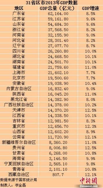 全国31省市区2013年GDP数据公布 山东排名第三(2014年04月05日)