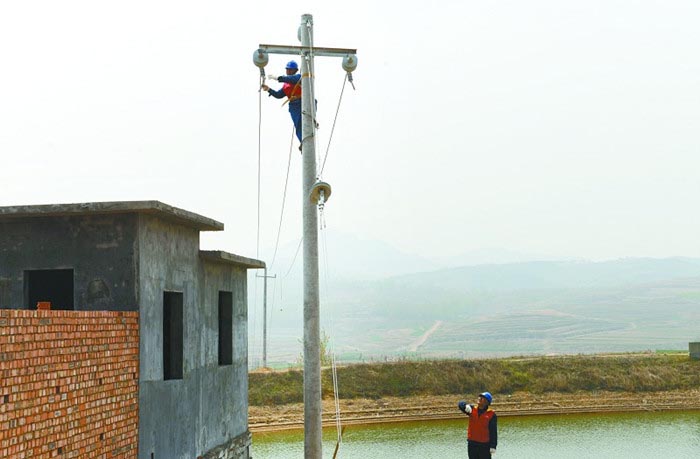 4月13日,国网日照供电公司岚山客户服务中心黄墩供电所工作人员正架设10千伏台子地村“小农水”供电线路。 当前正是小麦春灌的关键时期,国网日照供电公司大力支持小型农田水利建设工程,成立26支春灌彩虹共产党员服务队深入田间地头,为今年春耕播种保驾护航。据统计,该公司已出动服务人员820余人次,消除安全隐患94处,架设高低压线路46.5千米,新增专用变压器38台,为农业排灌设施的正常运转提供安全可靠的电力保证。