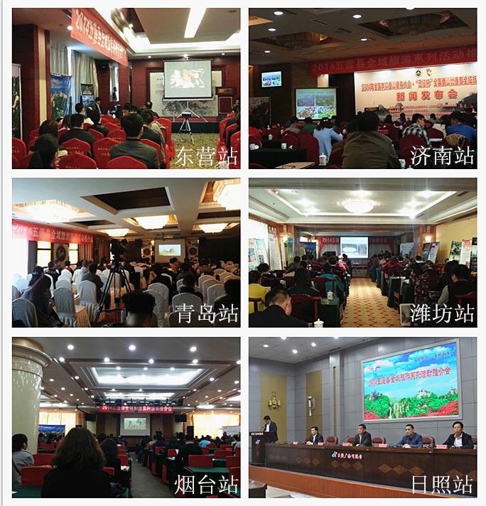 推介会由五莲县旅游和文体广电局牵头,组织20家景区(点)、宾馆酒店、旅行社以及松柏、叩官、户部等生态旅游型乡镇组成省内大篷车宣传推介队伍,全面推介五莲全域旅游和系列节会活动。2014五莲县全域旅游系列活动是五莲县加大全域旅游宣传力度,推进全域旅游发展的重要举措,共有八项大活动组成。一是2014年4月23日至7月将举办2014五莲县全域旅游系列活动启动仪式;二是央视《乡约·东坡鹊桥会》当家主持肖东坡现场当红娘大型综艺节目;三是2014年5月5日—7月5日,“美丽中国 山东之旅”中国摄影报“走进齐鲁胜地--五莲山”摄影联谊赛活动;四是2014年5月10日,全国群众登山健身大会五莲山站活动“五征杯”全国登山比赛暨2014年五莲县全民健身月“山东昱森杯”登山比赛;五是2014年5月13日—7月,五莲县第四届乡村游采摘节;六是2014年5月24日—5月26日,中国·五莲大青山第二届国际太极拳大赛;七是2014年6月上旬,日照市第四届全民健身运动会龙舟比赛;八是2014年6月上旬至12月,白鹭湾全年50场卡通动漫亲子话剧全面启动仪式。