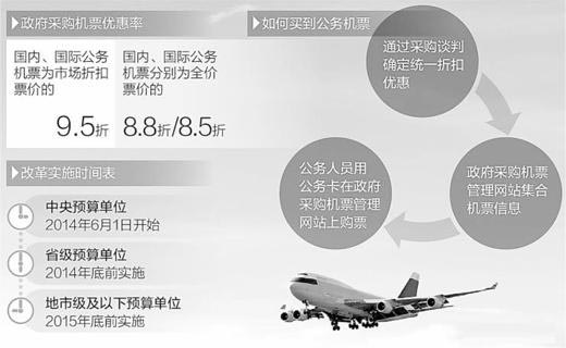 解读人:财政部政府采购管理办公室与中国民用航空局财务司有关负责人 6月1日起,公务机票购买管理改革将在全国范围内逐步实施。这项改革的政策目标和核心思路是什么?公务机票的折扣力度有多大?日前,财政部政府采购管理办公室与中国民用航空局财务司有关负责人进行了解读。 改革目标—— 规范购买行为,节约行政开支,支持国内航空公司 两部门相关负责人介绍,目前,在公务机票购买中,选择购买全价机票和非国内航空公司航班机票的现象较为普遍,甚至还出现个别单位采取伪造因公出国凭证、虚开发票等手段套取国家资金等问题。 针对公务机票购买存在的问题,财政部与中国民用航空局根据中央八项规定以及《党政机关厉行节约反对浪费条例》要求,并借鉴国外通行做法,推出了公务机票购买管理改革。以期通过强化市场竞争、建立公开透明的管理机制等措施,实现规范公务机票购买行为、压缩政府行政成本、支持国内航空公司发展的改革目标。 按照规定,各级国家机关、事业单位和团体组织工作人员,以及使用财政性资金购买公务机票的其他人员,购票人国内出差、因公临时出国,应当按照厉行节约和支持本国航空公司发展的原则,优先购买通过政府采购方式确定的我国航空公司航班优惠机票。 因公临时出国时,购票人应当选择直达目的地国家(地区)的国内航空公司航班出入境,没有直达航班的,应当选择国内航空公司航班到达的最邻近目的地国家(地区)进行中转。目前,我国航空公司航线已覆盖到世界各大洲大多数国家的中心城市,这一规定有利于国内航空公司国际航线的稳定与拓展。 优惠幅度—— 无论是市场全价票还是折扣票,公务机票均可再享优惠 与市场价格相比,公务机票购买的最大特点是可享“双折扣”。也就是说,公务人员根据公务行程购买机票,航空公司将按合同约定,在市场折扣票价基础上再给予一定折扣的优惠。目前的政府采购机票优惠率为:对于市场折扣机票,国内、国际公务机票为市场折扣票价的9.5折优惠;对于市场全价机票,则分别为全价票价的8.8折、8.5折优惠。 两部门相关负责人表示,这种统一折扣的优惠是通过采购谈判方式确定的,不同年度可能会发生变化,有关变动情况将在政府采购机票管理网站上及时发布。政府采购机票管理网站将集合各航空公司官方网站实时的市场机票信息,并公布具备中国民航机票销售资质的机构,包括各航空公司直销机构和代理销售机构。公务人员可选择在这些销售机构购票,也可使用公务卡在政府采购机票管理网站上直接购票。 由于改革涉及的单位、人员数量众多,需要分步推进。按时间安排,中央预算单位从2014年6月1日起开始实施,省级预算单位在2014年底前实施,地市级及以下预算单位在2015年底前全部实施。 节约支出—— 总体上公务机票价格低于社会其他同舱位票价,但不一定是市场最低价 许多人关心,“双折扣”后的公务机票是不是市场最低价?对此,两部门相关负责人解释说, 按照规定,公务人员要结合工作出行安排合理选择航班,尽可能选择低价机票,并非要求购买最低价机票。 从定价机制来看,航空公司在市场价基础上给予的统一折扣优惠,指的是各航空公司给普通客票的统一市场公布运价,并不包括航空公司给一些机票销售机构的特殊运价。当然,公务人员也可以按特殊票价购买这类机票,但不再享受政府采购优惠。 总体上看,改革后的公务机票价格会低于社会其他同舱位票价,但并不一定就是社会最低票价。随着改革的推进,还将逐步调整公务机票的定价机制,使改革既有利于节约行政成本,又有利于国内航空公司的发展。 两部门要求,航空公司和机票销售机构应按政府采购合同约定,做好相关履约工作。航空公司要按承诺的折扣率给予政府采购机票优惠,不能对公务机票进行舱位和价格的限定,要保证公务机票能随时购买。各机票销售代理机构要向公务人员提供国内、国际航线选择、购票方式等业务咨询服务,如实反映市场机票折扣信息,按照约定规则办理公务机票的退改签,及时提供机票报销凭证等。