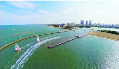 日照市万平口海滨生态公园游客们乘坐游艇、大帆船出海旅游观光。(航拍) 当日,日照市各海滨浴场游客渐多,各地游客尽享夏日海滨的清凉和惬意。