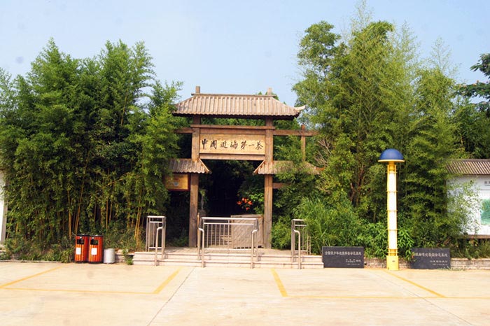 从一扇竹门进入茶园,便见一条小径蜿蜒向前,两侧柏树林立,紧挨着两行柏树的就是成片的茶树。茶园内有一块巨大的“天韵石”,上书“中国近海第一茶”七个大字,遒劲有力。这里的茶树比一般的茶树高一些,更加便于游客采摘。茶园内鸟语虫鸣,植被茂盛,空气极为清新,是一处难得的天然氧吧。此处名为“茶寿道”,游人漫步于“茶寿道”,从“十岁入学”到“一百零八岁茶寿人生”几经转折,几层阅历,顿感彻悟,如何写好如虹的自我,可谓智者见智,仁者见仁,各有所得各有所悟。