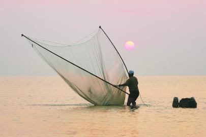 8月28日清晨,在山海天旅游度假区两城街道海边,渔民踩着高跷捕捞小虾。 初升的太阳与渔民劳作的身影构成了一幅美丽的画卷。
