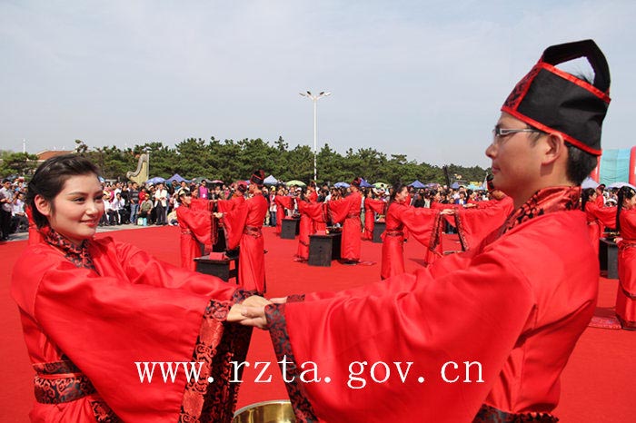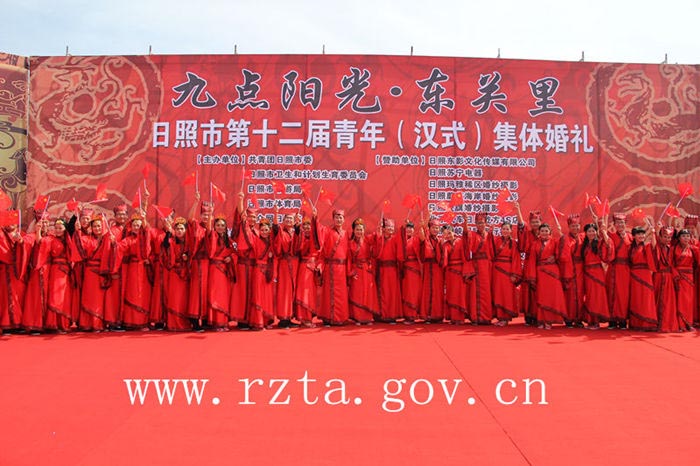 自2003年以来,日照市青年集体婚礼已经成功举办了11届,活动以其简约、时尚、文明的风格得到了社会各界的广泛关注,受到了广大青年的欢迎。今年,日照市首次通过汉礼的形式来举办集体婚礼,本届集体婚礼的宗旨是“倡导文明风尚,推进移风易俗,弘扬传统文化”。婚礼开始前,18对新人和万平口风景区的各地游客在签名墙上签下了自己的名字,表达对文明风尚和传统文化的推崇。