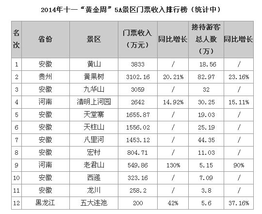 记者对2014年十一“黄金周”期间全国景区门票收入情况进行了统计,在已经公布数字的12个景区中,安徽黄山景区以门票收入3833万元暂列第一,但接待人数却排在第7位。有7个景区收入破千万级别,分别为安徽黄山、贵州黄果树、安徽九华山、河南清明上河园、安徽天堂寨、安徽天柱山、安徽八里河。