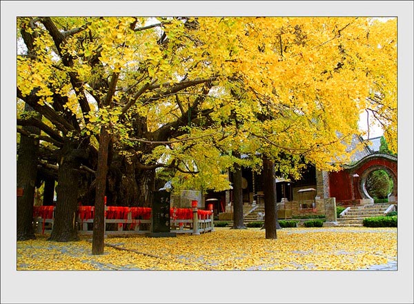 秋分已过,正是秋意渐浓时,在这果实丰硕、多彩多姿的秋天,不出门看看似乎有点愧对秋色。 莒县浮来山定林寺内那一颗有着5000年树龄的天下银杏第一树,应该会是我们赏秋的不二选择。秋风一起,银杏染秋,扇子般的银杏树叶一夜换上金黄色的衣衫,或挂枝头,或随风飘舞,或躺地上。清晨和黄昏,阳光透过金色叶子,照耀在这颗枝繁叶茂的古树上,景色让人陶醉,会不知不觉为它的灿若黄金的奇特景观所征服!