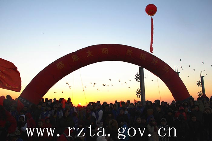1月1日早上6:15,欢快的歌声唤醒沉睡的大地,精彩的表演拉开黎明的序曲;按照日照地区民间流传的“燔柴祀日”远古习俗,摆上三牲祭品,重现远古祭拜太阳的场景;太阳升起的时刻,撞响“太阳圣钟”,伴随着悠扬的钟声,八万余人一起面向太阳,感恩太阳,祈福未来;市民游客在寄语板上写下对新年的美好祝福;空中飞艇“天女散花”般从空中洒下幸运奖品,人们在参与活动的同时,还赢得奖品,象征了新年的好兆头。
