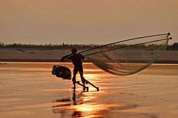 海虾生性胆小,活动在岸边平坦的浅水水中,如果用船捕捞往往会受惊而逃。因此,这里的先民创造了踩着高跷捕捞海虾的劳作方式。他们所用的虾网如同簸箕,网杆长达5米多,网口宽度也近4米;所踩的高跷,一般分为两到三节,每节高约1米,根据距离海岸的远近,随海水的深浅而增减高跷的木杆。
