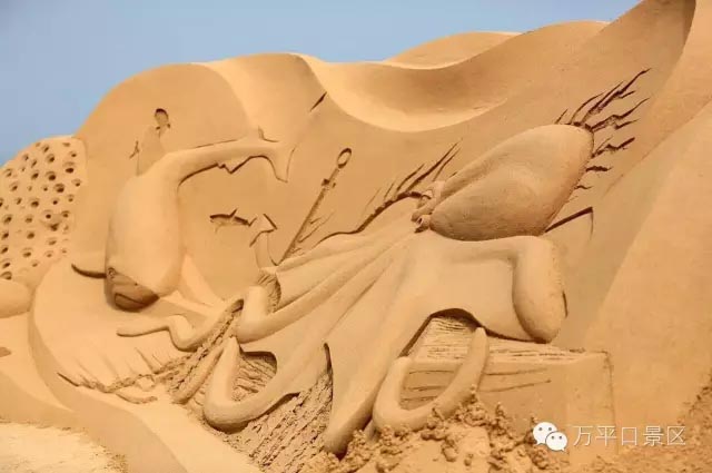 沙雕,这项“大地的艺术”,通过堆、挖、雕、掏等手段塑成各种造型,具有强烈的视觉冲击力,作品完成以后经过表面喷洒特制的胶水加固。此次沙雕艺术品展览作为万平口新增的娱乐项目之一,将持续到十月份左右。