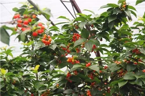 细细看去,每一个枝头上都密密麻麻的挤满了樱桃果,一串串、一排排,红的黄的青的樱桃,诱人伸手。“斜日庭前风袅袅,碧油千片漏红珠”,好一派樱桃丰收的场景。