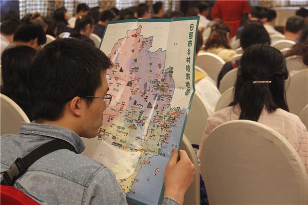 南京市中国旅行社经理崔晋拿着一张日照乡村旅游地图研究不停,“近几年,日照旅游推出了一系列具有乡村风情的民俗旅游产品,像捕鱼、垂钓、狩猎、采摘,这些产品加深了游客的旅游体验,特别受欢迎,今天来看看进一步加强合作。”