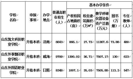 9月30日,山东省高校设置评议委员会办公室发布《关于2017年列入专家考察的申报设置高等学校的公示》。 根据《中华人民共和国高等教育法》《普通高等学校设置暂行条例》和《普通本科学校设置暂行规定》等有关规定,省高校设置评议委员会办公室拟于近期组织专家组对山东凯文科技职业学院申请升格为济南工学院、山东外事翻译职业学院申请升格为山东外事翻译学院、山东外国语职业学院申请升格为山东经贸学院进行实地考察评审,现将学校情况予以公示。 备注:上述数据均来自各校提供的申报材料。