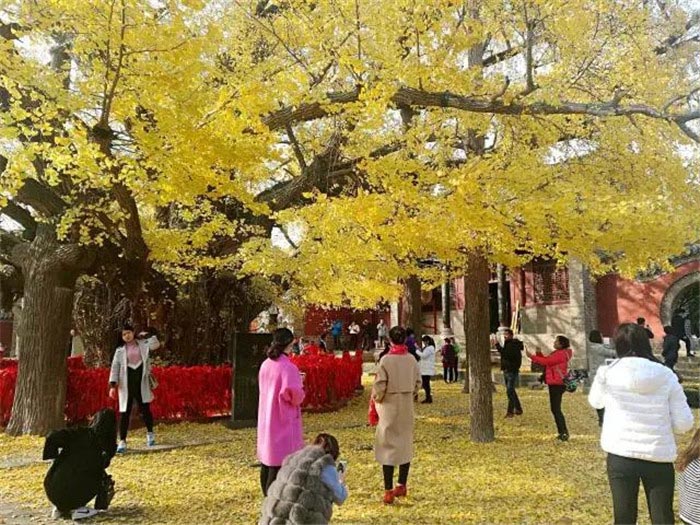 (这两张从下往上拍的照片很明显能看出来,银杏树的树冠部分变黄了,但是底部的还是绿色的居多。)